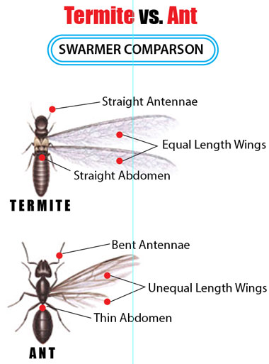 GoEco pest control team can recognize the first sign of termite activity and catch them before damaging your house and buildings. Call us for free inspection if you find termite in our house, business, and surrounds. Following picture will provide you with how to distinguish termite from ant.